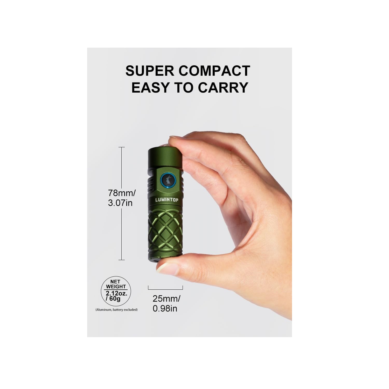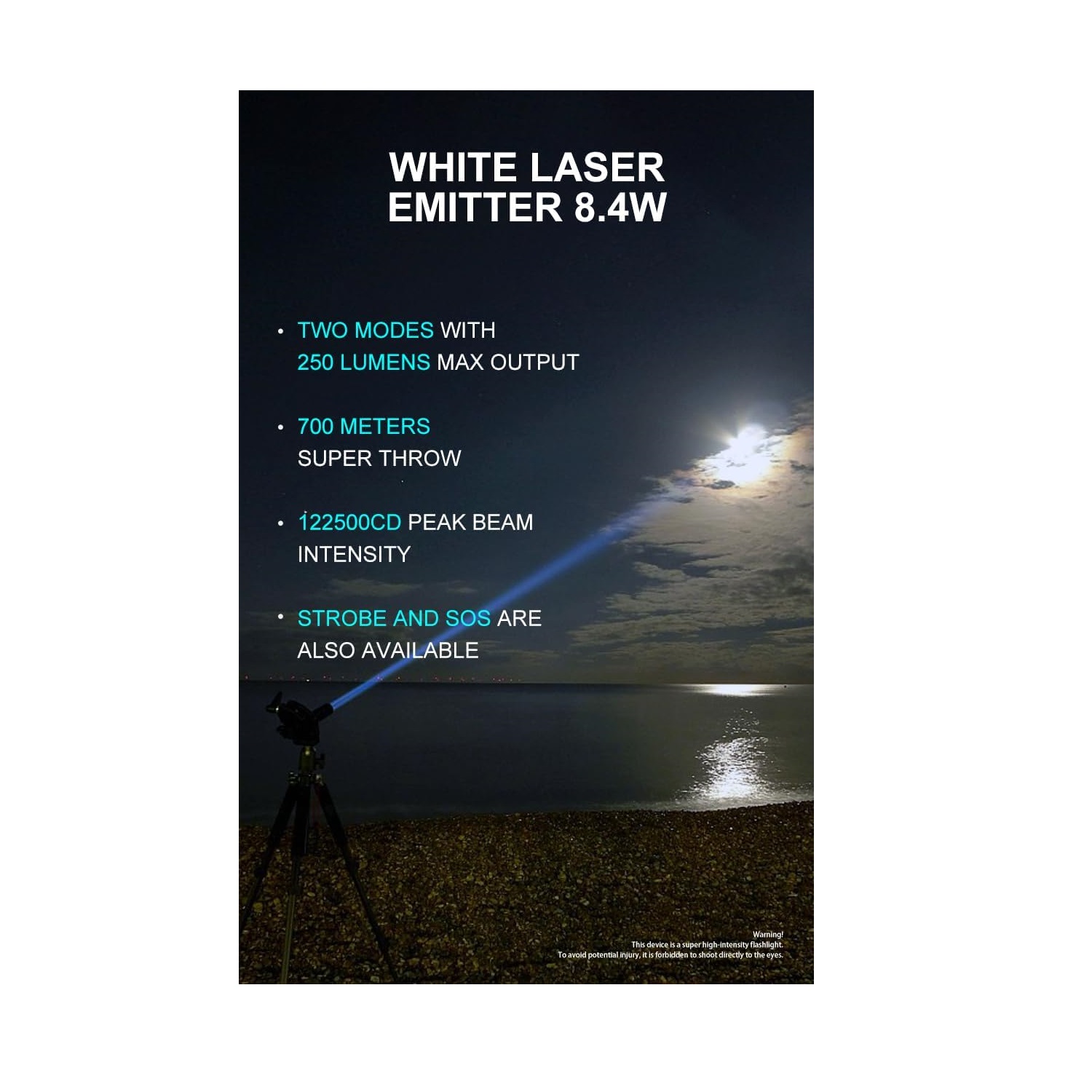 فناوری نوآورانه LEP: چراغ قوه Lumintop Thor MINI فناوری پیشرفته لیزر فسفر تحریک شده (LEP) را معرفی میکند که از لیزر سفید برای ایجاد پرتویی فوقالعاده روشن و متمرکز استفاده میکند. این فناوری پیشرفته، استاندارد جدیدی را در نورپردازی تعیین میکند و روشنایی و دقت بینظیری را ارائه میدهد. هیچ باتری لیتیومی مستقلی با این محصول فروخته نمیشود.