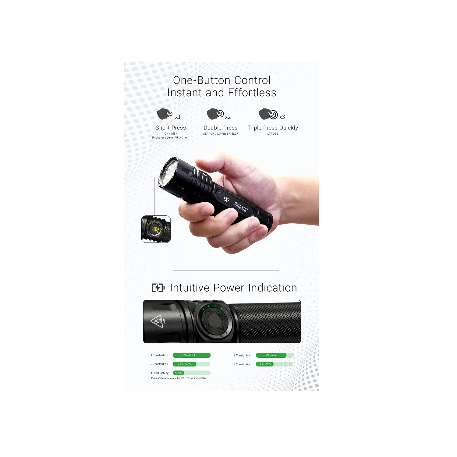 EX7 مجهز به حالت چشمکزن تصادفی و حالت Lumin Shield با حداکثر خروجی برای هشدار و نجات در شرایط بحرانی است. باتری قدرتمند آن با دوام بیش از ۲۳ روز در حالت Ultralow، از طریق پورت USB-C داخلی قابل شارژ است.